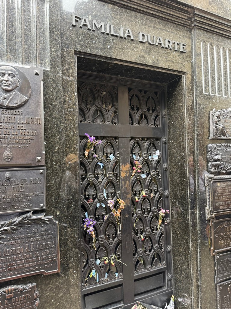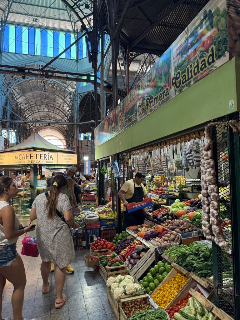 On Sundays the San Telmo Market is bustling with activity, There are produce stalls and jewelry shops and dozens of restaurants. The building itself is reminiscent of a French market, with an iron framework and colorful glass. We wander through the market, but nothing is very appealing. The fruits and vegetables seem tired, and a lot of the shops are selling junk. The restaurants appear to be the main attraction. We buy some nice pastries.
