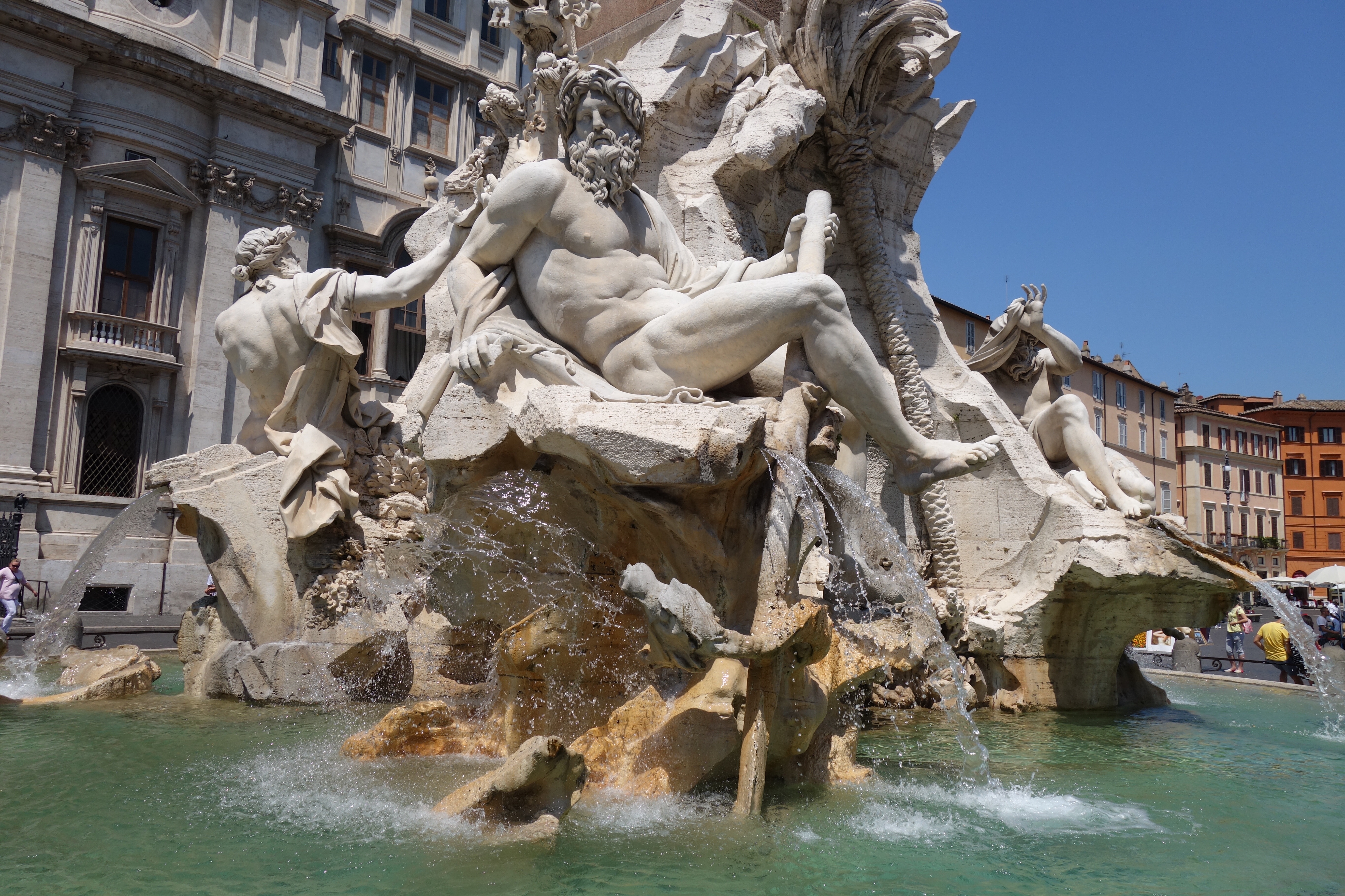 After pointing out a few likely places for lunch, espresso or gelato, and passing the Trevi Fountain which is under renovation, we end our tour at the Piazza Navona, with its three fountains, including the central fountain by Bernini called the “Fontana die Quattro Fiume ” or Fountain of the Four Rivers. The temperature is now into the mid nineties, so we find a likely spot for lunch that features air conditioning on the menu and cool off.
